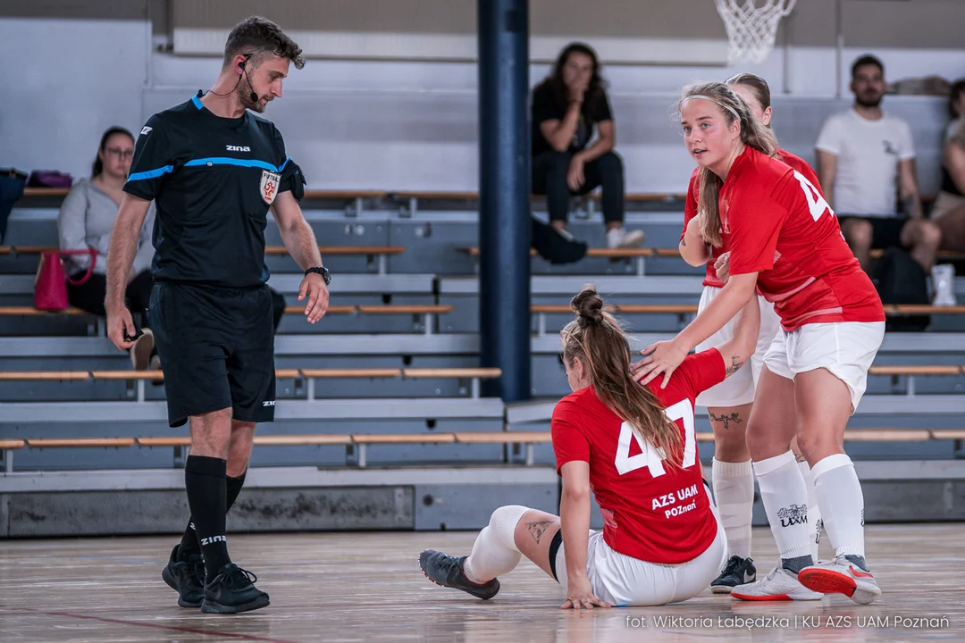 Paula Fronczak (z prawej) w trakcie spotkania 1. kolejki Ekstraligi Futsalu Kobiet (fot. Wiktoria Łabędzka / KU AZS UAM Poznań)