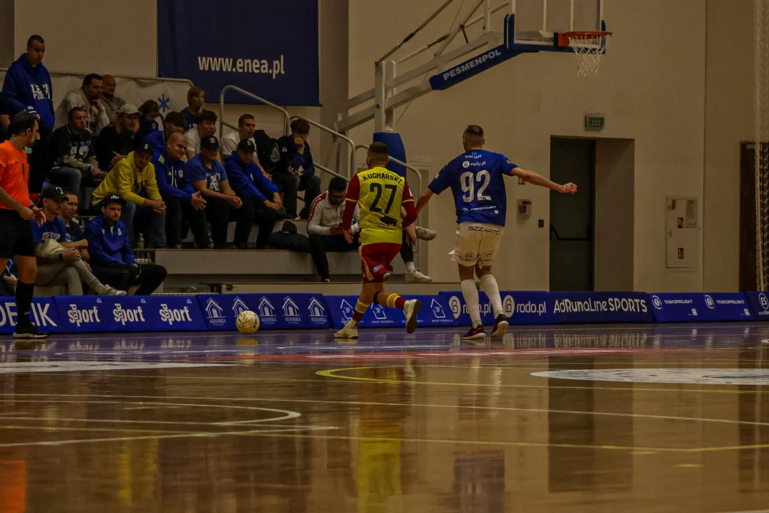 Wiara Lecha w swoim stylu wysoko wyszła na Jagiellonię Białystok i bardzo agresywnie naciskała na rywali w pressingu. Gospodarze mocno bazowali na dalekich podaniach, szukając sobie przestrzeni do indywidualnych rajdów. Główną osią ataków był przede wszystkim duet Cepeda-Ozuna - każdy z tych zawodników starał się w pojedynkę sforsować obronę przyjezdnych.Jagiellonia nie potrafiła stworzyć poważnego zagrożenia pod bramką Marka Kusnira w pierwszych minutach gry. Goście najczęściej swoich okazji szukali po mocnych strzałach z dystansu, ale były one wyjątkowo niecelne. Futsaliści "Jagi" łatwo tracili piłki po niecelnych podaniach, będąc pod presją. Mimo problemów to oni w 12. minucie wyszli na pierwsze prowadzenie w meczu. Po stałym fragmencie gry pierwszy do siatki trafił Cristian Neme.