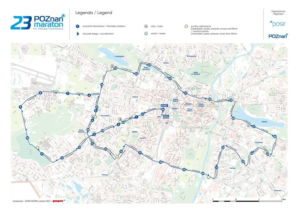 Zawodnicy o godzinie 9:00 po starcie na ul. Grunwaldzkiej wyruszą w stronę Enea Stadionu. Ulicami Bułgarską i Bukowską będą kierować się w stronę Portu Lotniczego Ławica. Kolejne kilometry trasy będą przebiegać ulicami Złotowską, Owczą oraz Cmentarną, by znów wrócić na ulicę Grunwaldzką i podążać przez Raszyn do ul. Hetmańskiej, która poprowadzi uczestników aż do Ronda Starołęka. Następnie Maratończycy udadzą się na poznańskie Rataje, a dalej przebiegną w pobliżu Jeziora Maltańskiego oraz Katedry. W dalszej części trasy biegacze i biegaczki odwiedzą Stare Miasto i malowniczy Sołacz. Ostatnie 10 kilometrów przebiegnie ulicami: Niestachowską, św. Wawrzyńca, Polską, Bułgarską oraz Grunwaldzką, z której w okolicach Bałtyku zawodnicy skręcą na teren Targów, by finiszować na Placu Marka.