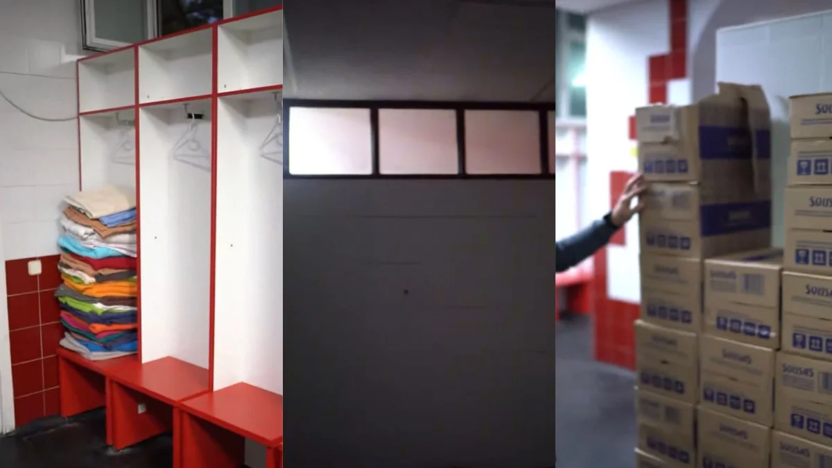 Już pierwsze ujęcia nagrania wzbudziły spore poruszenie. Po otwarciu drzwi do szatni można zobaczyć kartony z butelkami wody mineralnej, zajmujące znaczną część pomieszczenia. Następnie uwagę zwracają odpływy wody częściowo zaklejone taśmą.