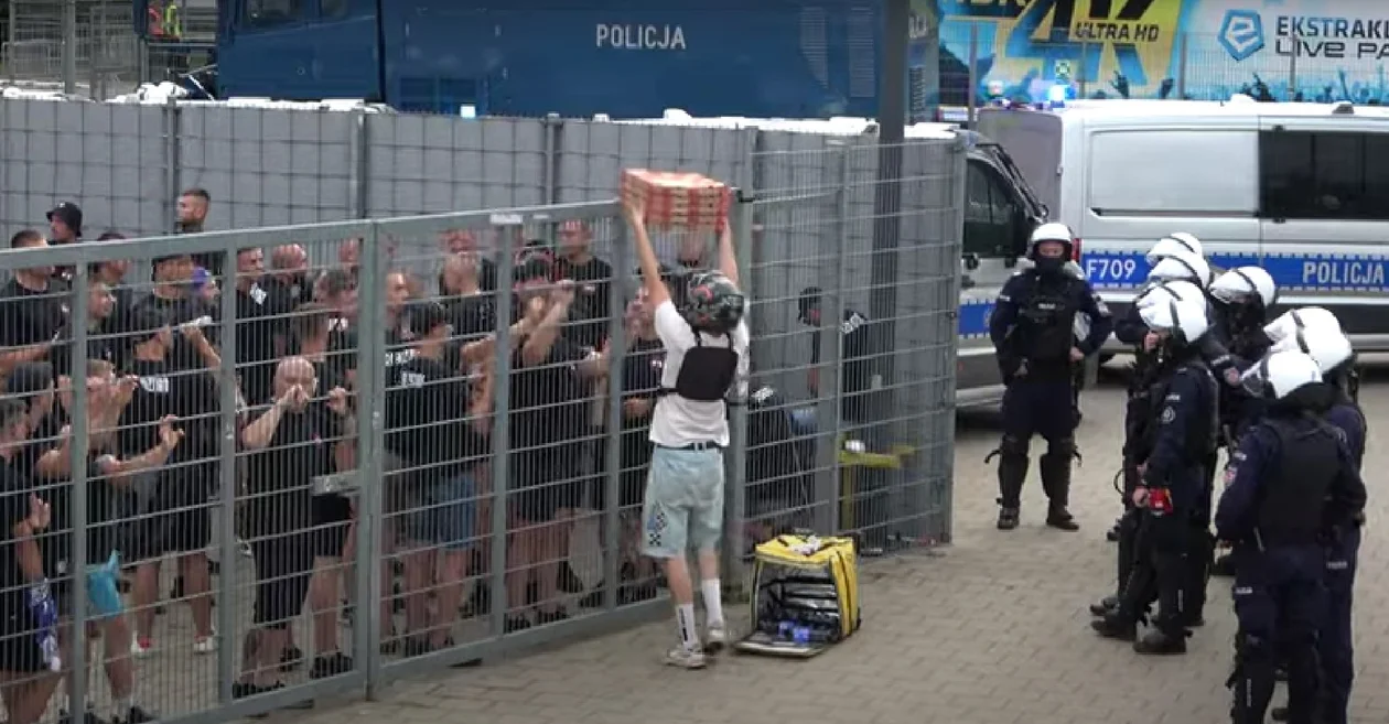 Zanim jednak mecz się rozpoczął, kibice Kolejorza postanowili się posilić. Ponieważ już weszli do sektora dla przyjezdnych, taki właśnie adres docelowy podali kurierowi dostarczającemu jedzenie. Pod koniec filmu widać, jak mężczyzna z charakterystycznym plecakiem podchodzi do znajdującej się za stadionową bramą grupy, najpierw rozlicza się z nimi, a potem nad bramą przekazuje kilka kartonowych pudełek z pizzą oraz butelki z napojami. Wszystko odbywa się pod bacznym okiem policjantów.