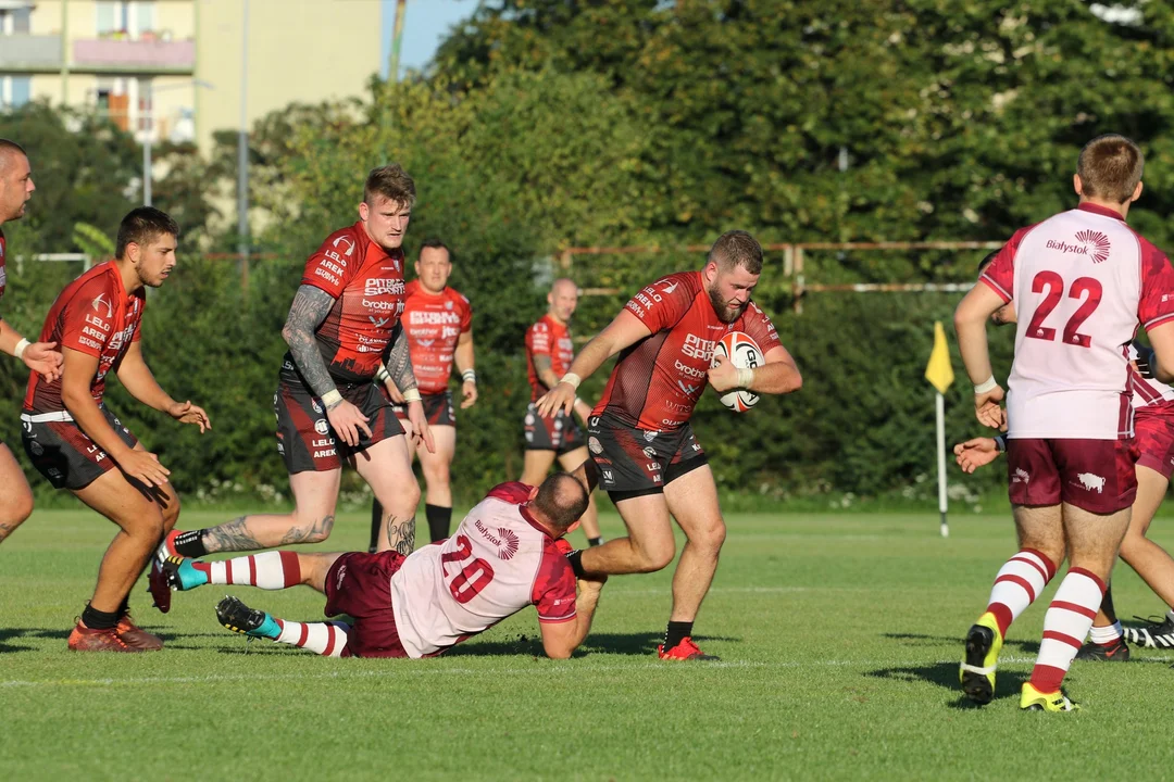 Po początkowej przewadze liderów I Ligi do głosu zaczęli dochodzić przyjezdni. Już pierwsza ofensywna akcja przyniosła powodzenie w postaci punktów. Skumulowanie defensywy gospodarzy w środkowej strefie boiska pozwoliło na szybkie zagranie na skrzydło, gdzie przy linii bocznej udało się położyć pierwsze przyłożenie. Szybko odpowiedzieli na to jednak białostoczanie – Siraha otrzymał piłkę na dwudziestym metrze i wykorzystując lukę w obronie gości wdarł się na pole punktowe.
